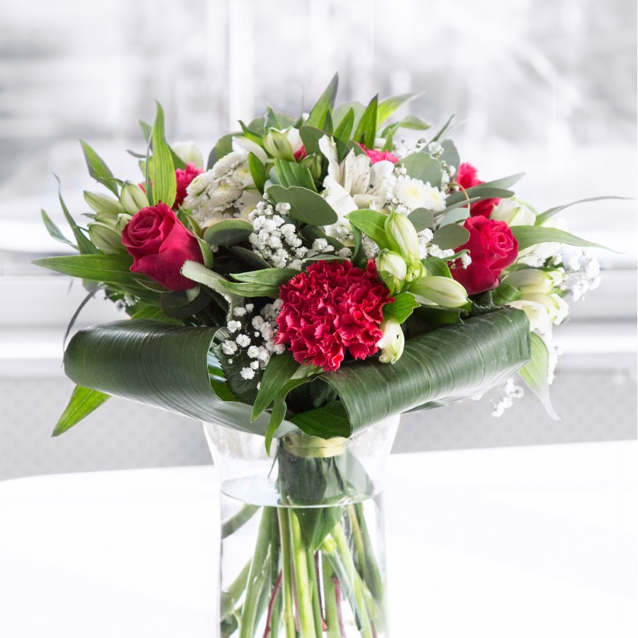 Step into a world of enchantment with our Enchanted Blossom Collection, a bouquet that dazzles the senses with its rich combination of colors and textures. Featuring the bold allure of red roses paired with the soft radiance of white chrysanthemums, this arrangement is perfectly adorned with gypsophila, carnations, white alstroemeria, and aspidistra leaves. Each flower is hand-selected to deliver the utmost quality and lasting freshness.